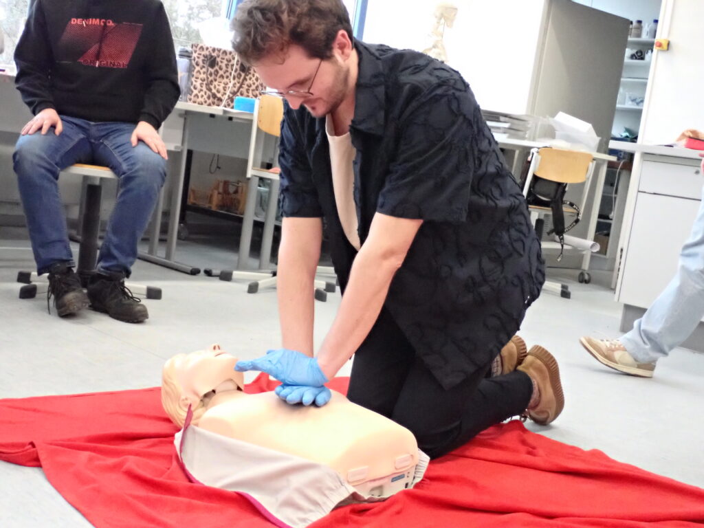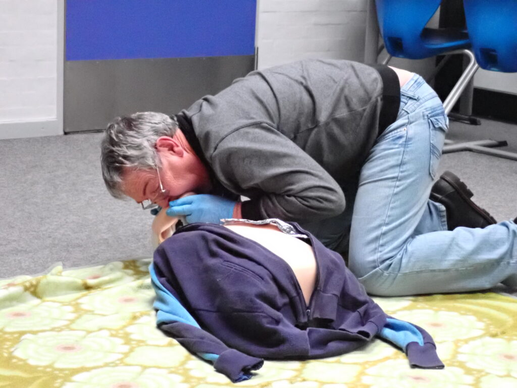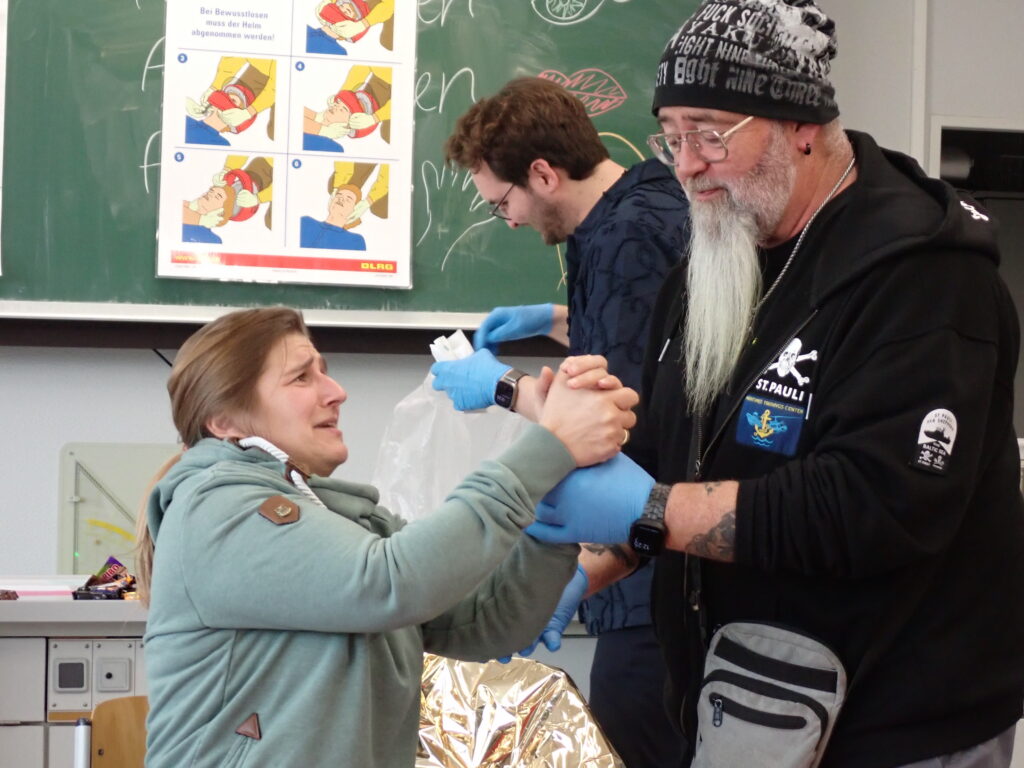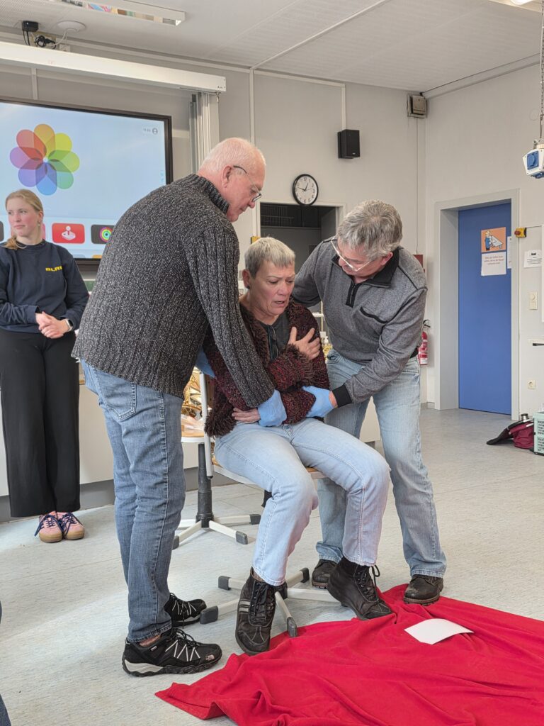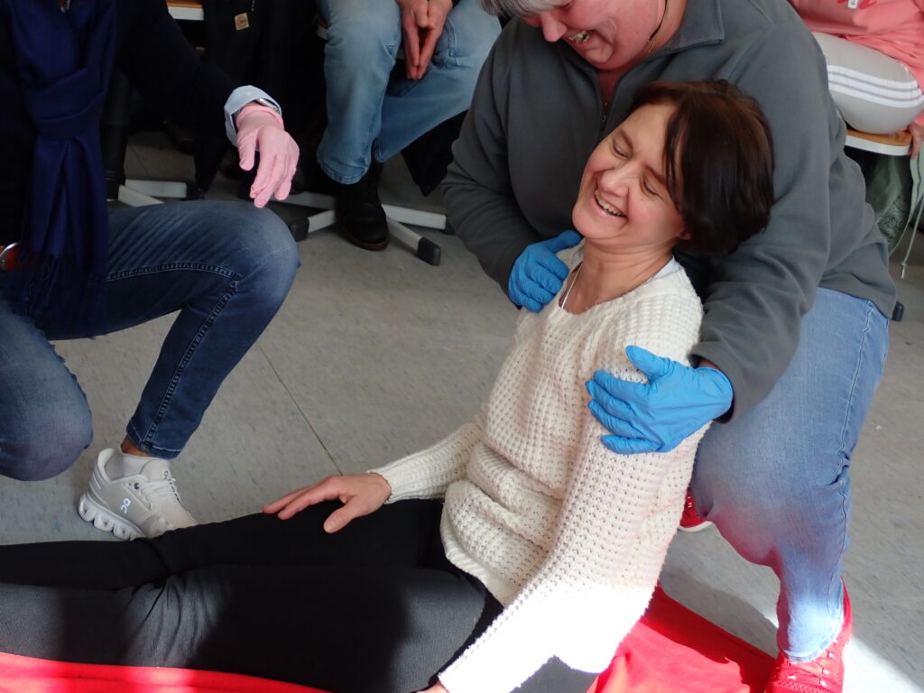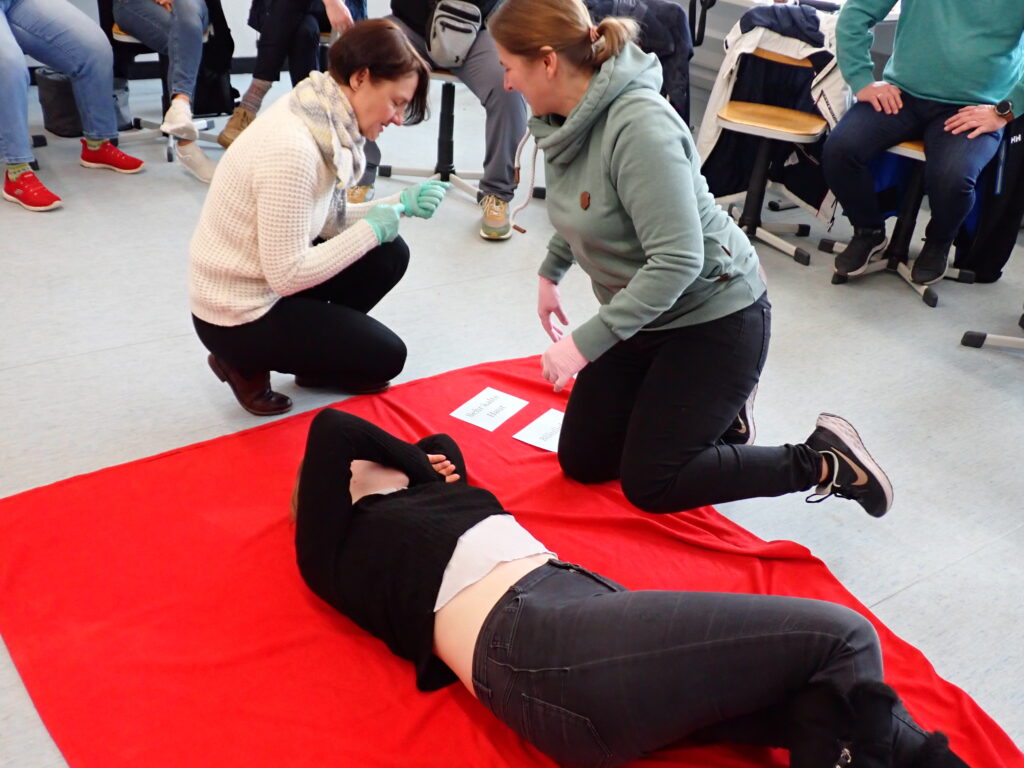 Neben dem Auffrischen grundlegender Maßnahmen der Ersten Hilfe standen insbesondere typische Notfallsituationen im Mittelpunkt, bei denen schnelles und besonnenes Handeln gefragt ist. Durch anschauliche Fallbeispiele, praktische Übungen und den offenen Austausch konnten vorhandene Kenntnisse gefestigt und neue Impulse gewonnen werden. Gerade die praxisnah inszenierten Fallbeispiele sorgten für eine besonders intensive Auseinandersetzung mit den Inhalten. Dabei stellte jeweils ein Teilnehmender eine Notfallsituation dar, während Zweier-Teams aus der Gruppe die Lage einschätzten und die passenden Maßnahmen umsetzten. Diese direkte Anwendung des zuvor Gelernten förderte nicht nur das Verständnis, sondern brachte – je nach Darstellung der Situation – auch einige herzhafte Lacher mit sich und lockerte die konzentrierte Lernatmosphäre auf angenehme Weise auf.